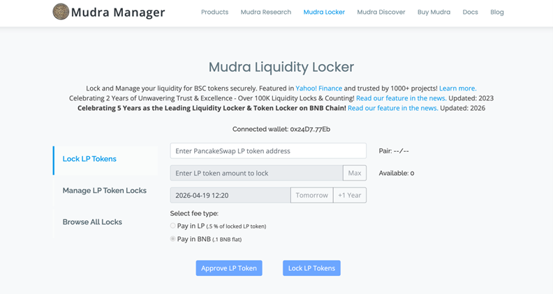 Mudra operates two core products that together cover every locking need on BNB Chain: the Liquidity Locker for PancakeSwap LP tokens, and the Token Locker for BEP-20 team vesting and strategic allocations.